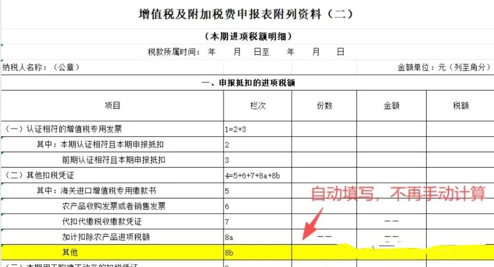 纳税申报时,不再需要手动计算方式填列,而是在电子发票服务平台对其用途进行确认,确认后自动填入《增值税及附加税费申报表附列资料(二)》“(二)其他扣税凭证”第8b栏中。