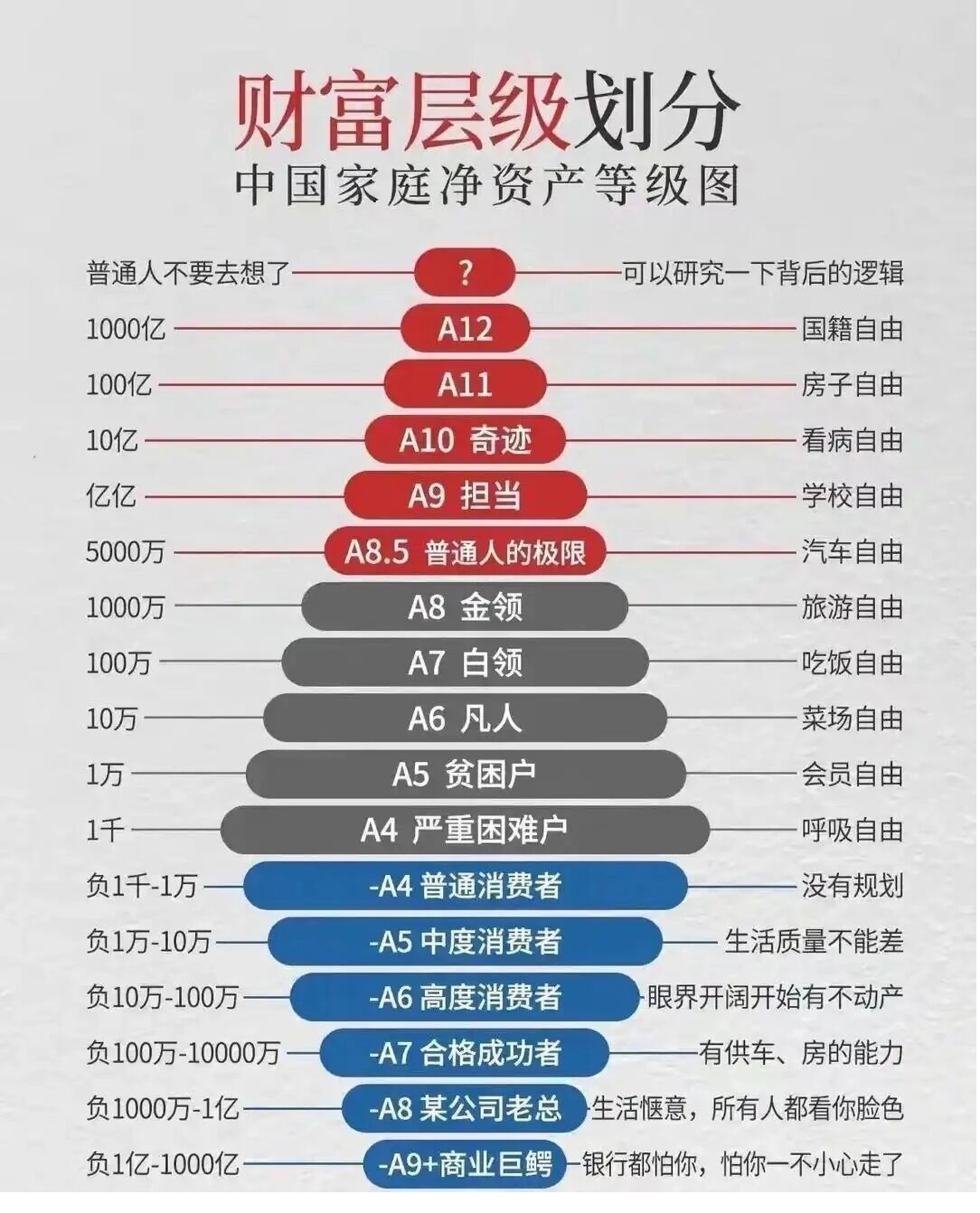 -A8级:负1000万~1亿,公司老总,生活惬意,公司上下人都看其脸色。(没错,我要看我老板的脸色)