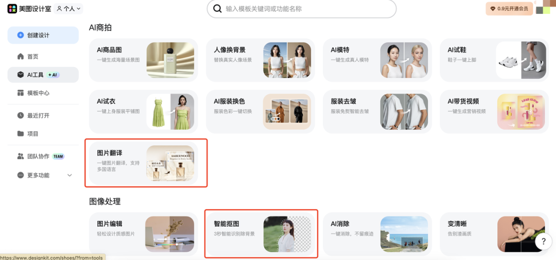 除了以上的AI生图工具,美图设计室还有一些电商人常用的图片编辑工具,在线编辑很方便,储存在云端也不怕素材丢失,例如我们常用的抠图和图片翻译。