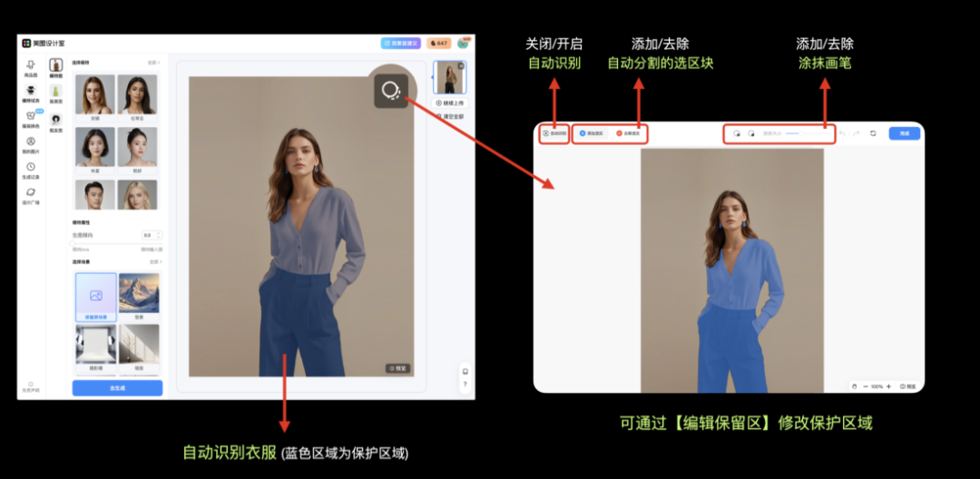 这个产品亮点是“AI只换模特,不会让你原本的产品变形”,原因是在替换AI模特前,网站会自动把你需要售卖的服装区域保护起来,即使你的产品不是服装,而是项链/耳环,也可以手动改保护区域,这样就能保证,被你“保护”的部分不会被AI更改,这点优势是连midjourney和SD都难以做到。