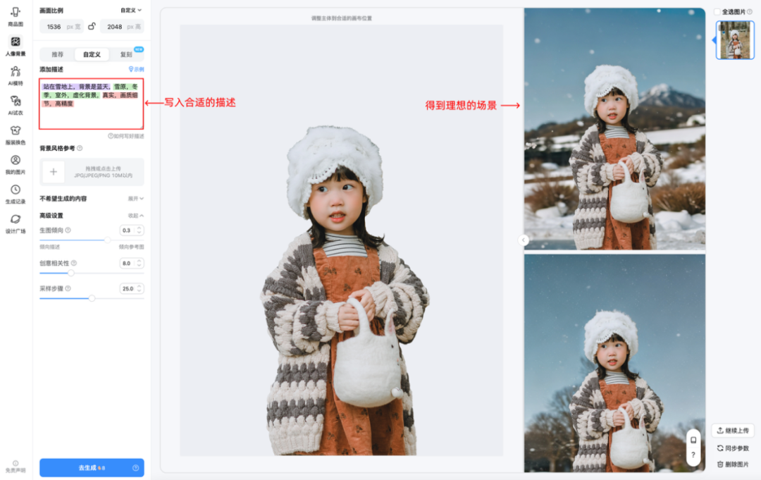 2、多生成多筛选;AI每次生成的结果都有差异,建议一次性生成10-20张,选出最合适的2-3张进行深加工。不要期望一次就能得到完美图片。