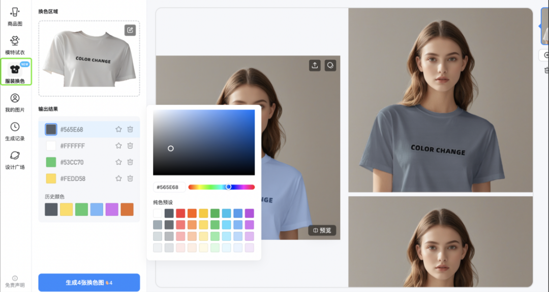 操作步骤也十分简单,上传服装图自动识别服装品类并精准显示换色区域,也能手动修改;色谱覆盖全色系,单次可选择4个颜色一起生成,还能保留服装明暗褶皱细节。
