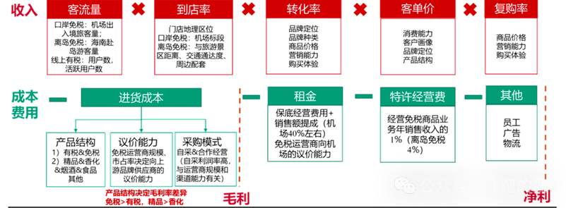 赚钱多少要过五道关:先有足够客流量,再看多少人进店、进店后多少人下单、每人买多少钱、会不会重复购买,这五个指标直接决定收入规模;成本端则看两头,一是进货价(直接影响毛利率高低),二是租金(运营商规模越大,跟机场谈租金的话语权越强,租金成本越可控)。