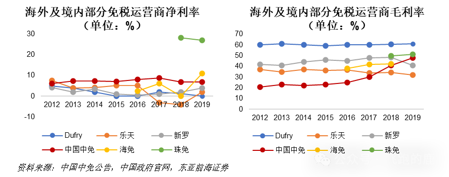 ③中国中免从 2017 年起毛利率明显提升,但新增的机场免税店净利率不高,限制了整体净利率增长,不过营业利润率仍比国际同行高;