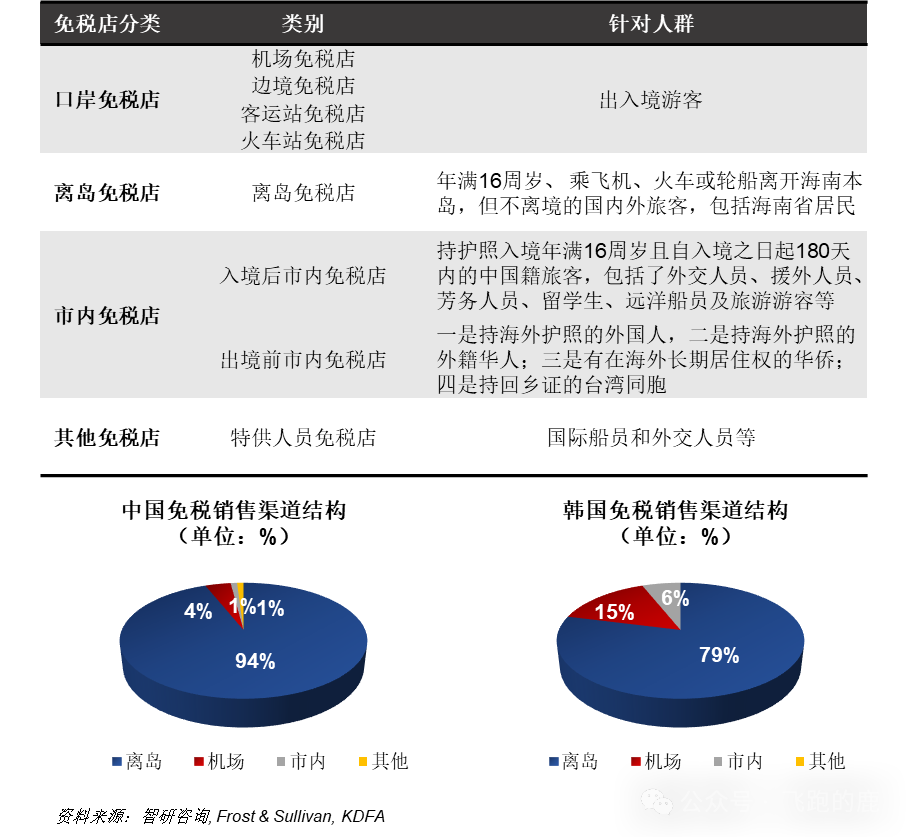 从经营方式上,免税渠道分四类:口岸、离岛、市内及其他。中国免税以离岛免税为核心,2023 年份额 90%+(Frost & Sullivan);韩国以市内免税为主,2023 年全年占比 78%(KDFA)。