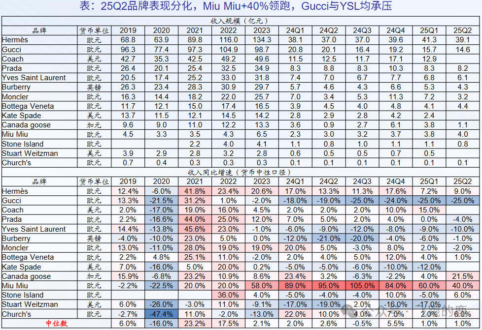 把 25Q2 各品牌的收入同比增速(按货币中性口径计算)排个序,处于中间位置的品牌增速是 1.0%,这个水平和今年 Q1 持平。