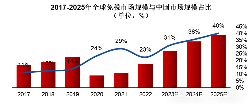 2021 年全球免税市场的总盘子超 1600 亿人民币,中国市场拿下了 29% 的份额;按照当前趋势,到 2025 年,中国在全球免税市场的占比预计将突破 40%,成为全球免税市场的核心增长引擎。