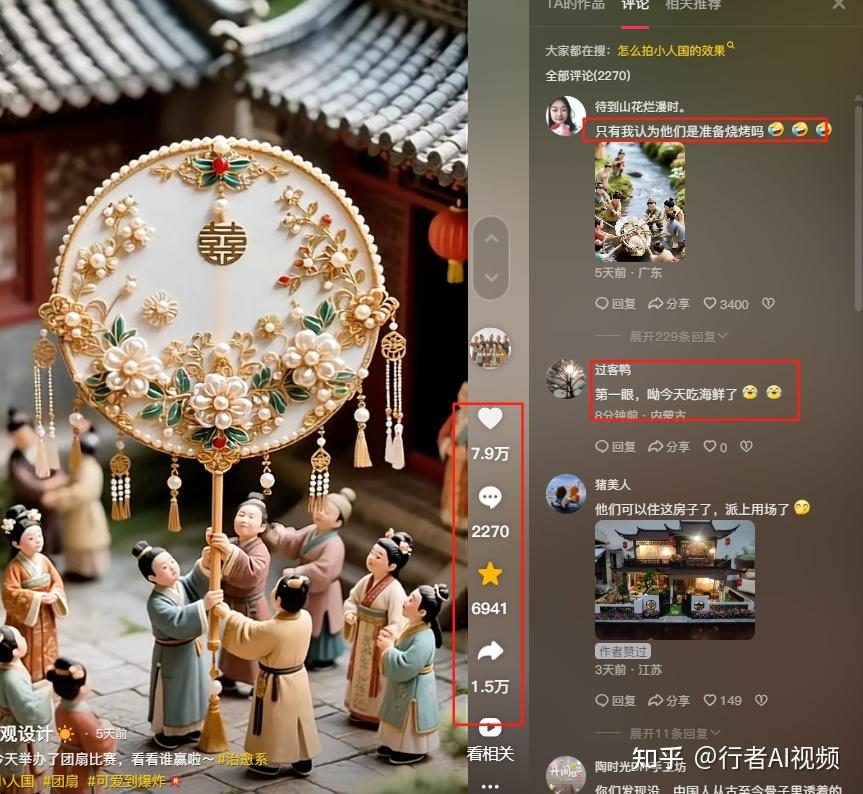 下面这条做团扇比赛(非遗文化)的视频高达 7.9 万赞,评论区炸开了。有槽点,有梗,也有民族文化,互动数据很好。