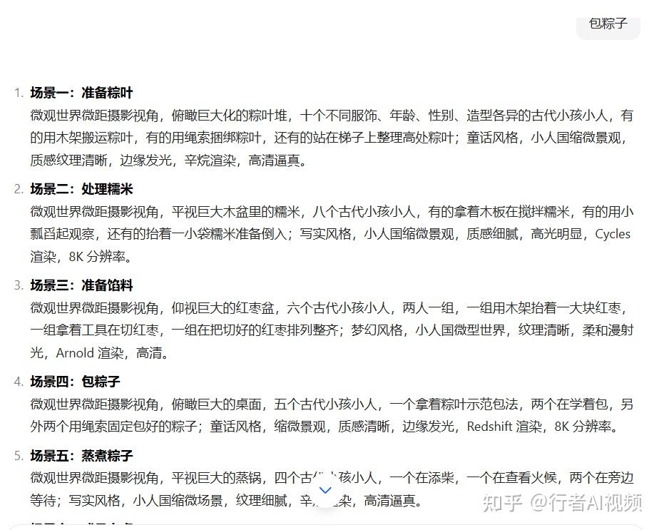 使用方法:打开智能体,输入我们要做的选题(比如包粽子),AI 就能自动生成完整的分镜提示词。