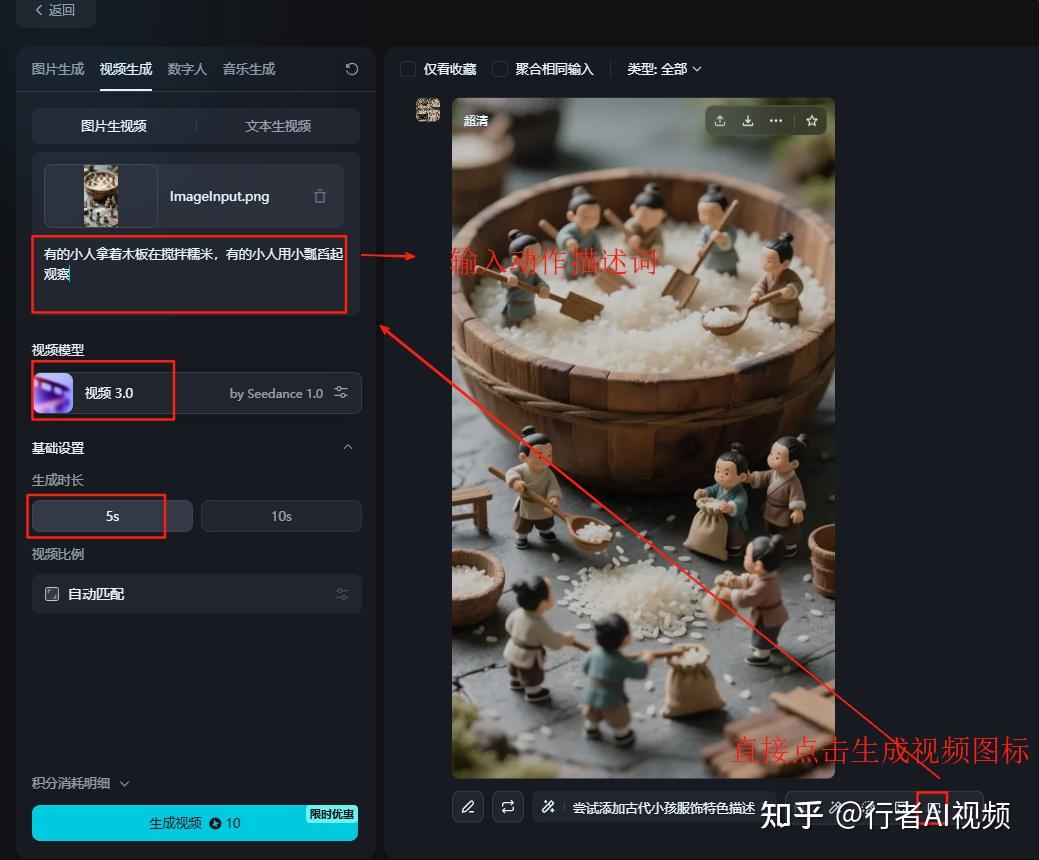 点击图片下面的生成视频图标,左侧区域输入图生视频提示词